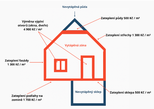 - Zateplení fasády, střechy, podlahy nad exteriérem – 1 300 Kč/m²